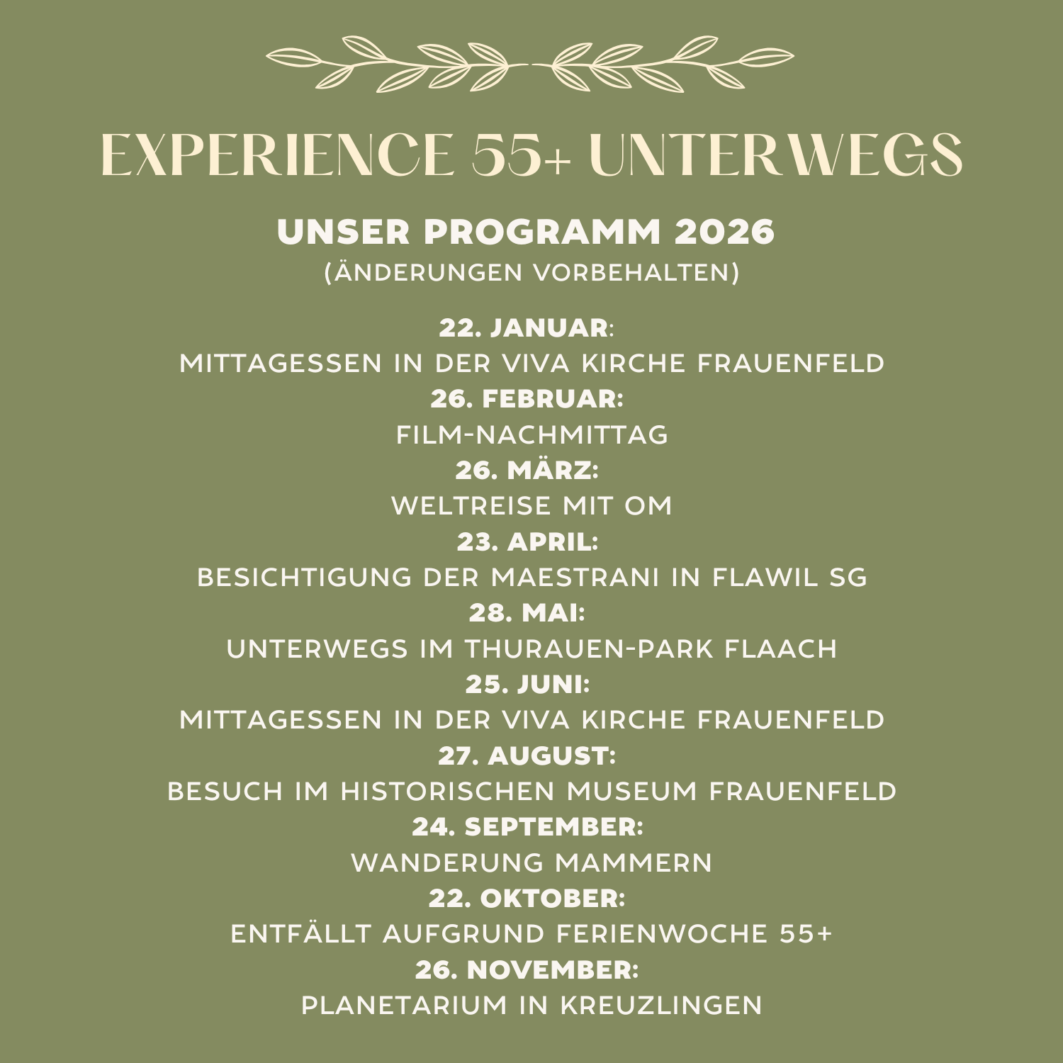 Wir starten am 22. Januar ins neue Jahr mit Experience + 55 Unterwegs. Zum Jahresbeginn laden wir Euch herzlich zu einem Mittagessen in der Viva Kirche Frauenfeld ein. Wir freuen uns auf ein schmackhaftes Essen und gute Gemeinschaft.