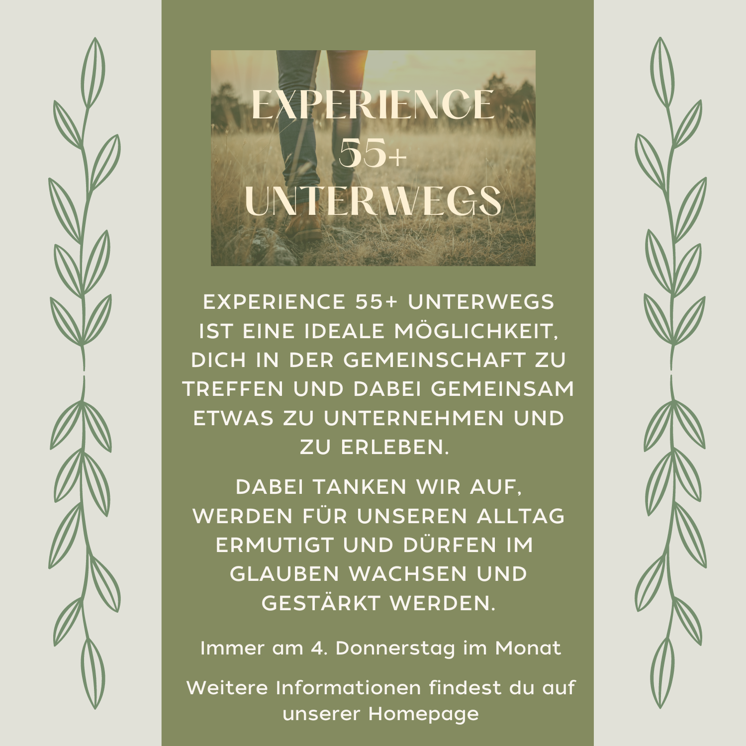 - 1x monatlich wird der „Monatsbrief“ speziell für den Bereich Experience 55+ versendet. Wenn du Interesse an diesen bereichsspezifischen Informationen/News hast, darfst du dich gerne bei Franziska (franziska.chiavi@vivakirche.ch) melden